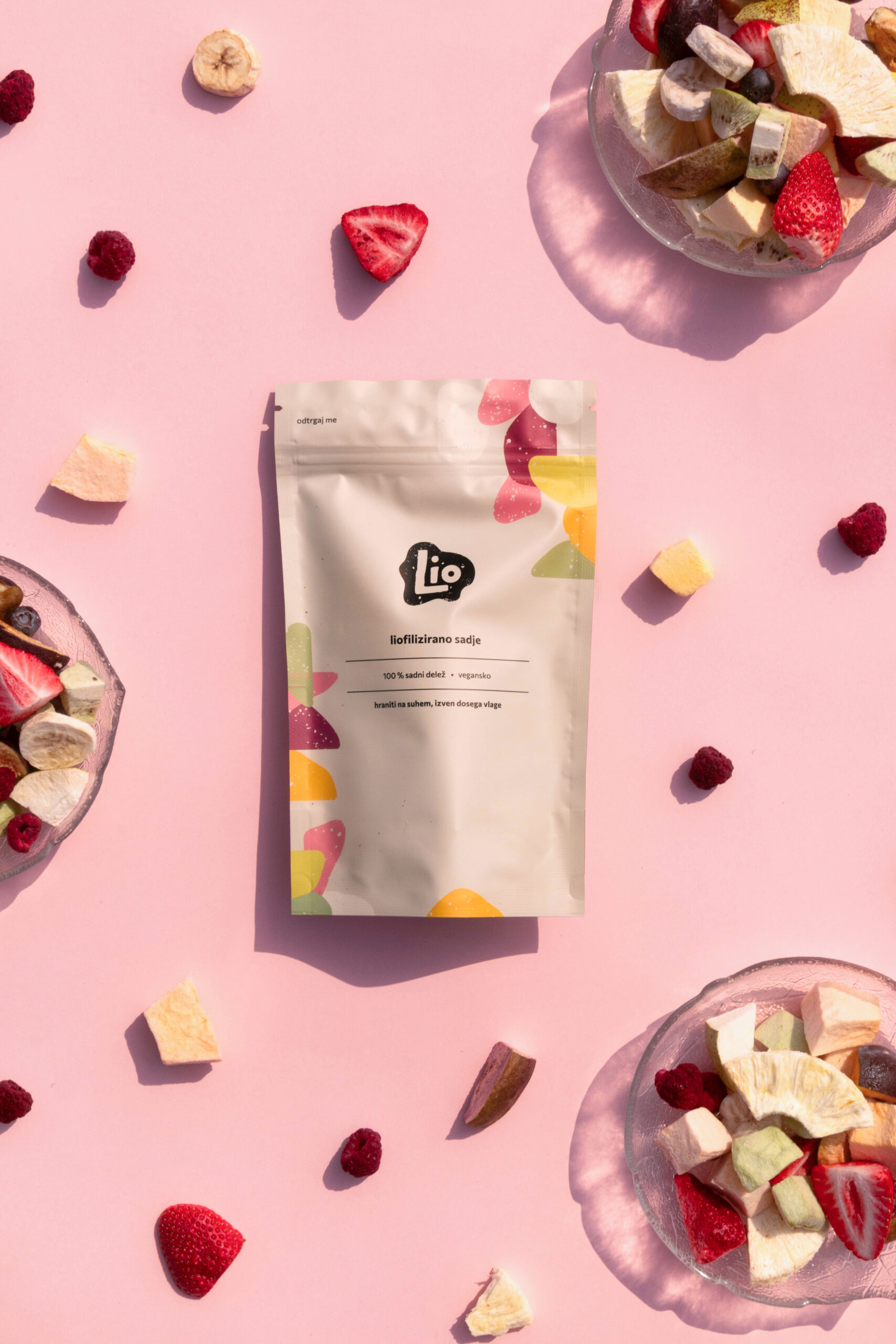 Paketek vsebuje različno liofilizirano sadje. 100% Vegansko, 100% naravno, brez dodanih sladkorjev. V paketku je različno sadje (odvisno od sezone), trudimo se vključevati čimveč lokalnega/slovenskega oz. bio sadja. Stalnica v paketu so jagode, kivi, maline, mango, banane in ananas.